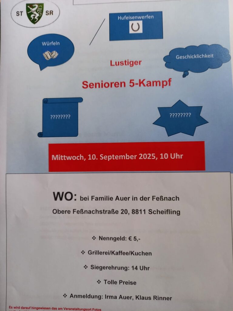 Aufgrund der Wettervorhersage für Mittwoch (intensiver Regen) müssen wir leider den Lustigen Seniorenfünfkampf absagen!